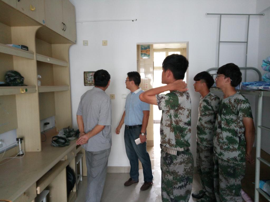 9月20日我院党总支书记邵波,副院长王书林,党总支副书记管明清和我院学工办相关老师到东区03幢我院男生宿舍进行走访,了解学生军训期间的精神状态,询问相关生活困难,同时利用相关机会对同学们进行爱国主义和国防意识的教育。